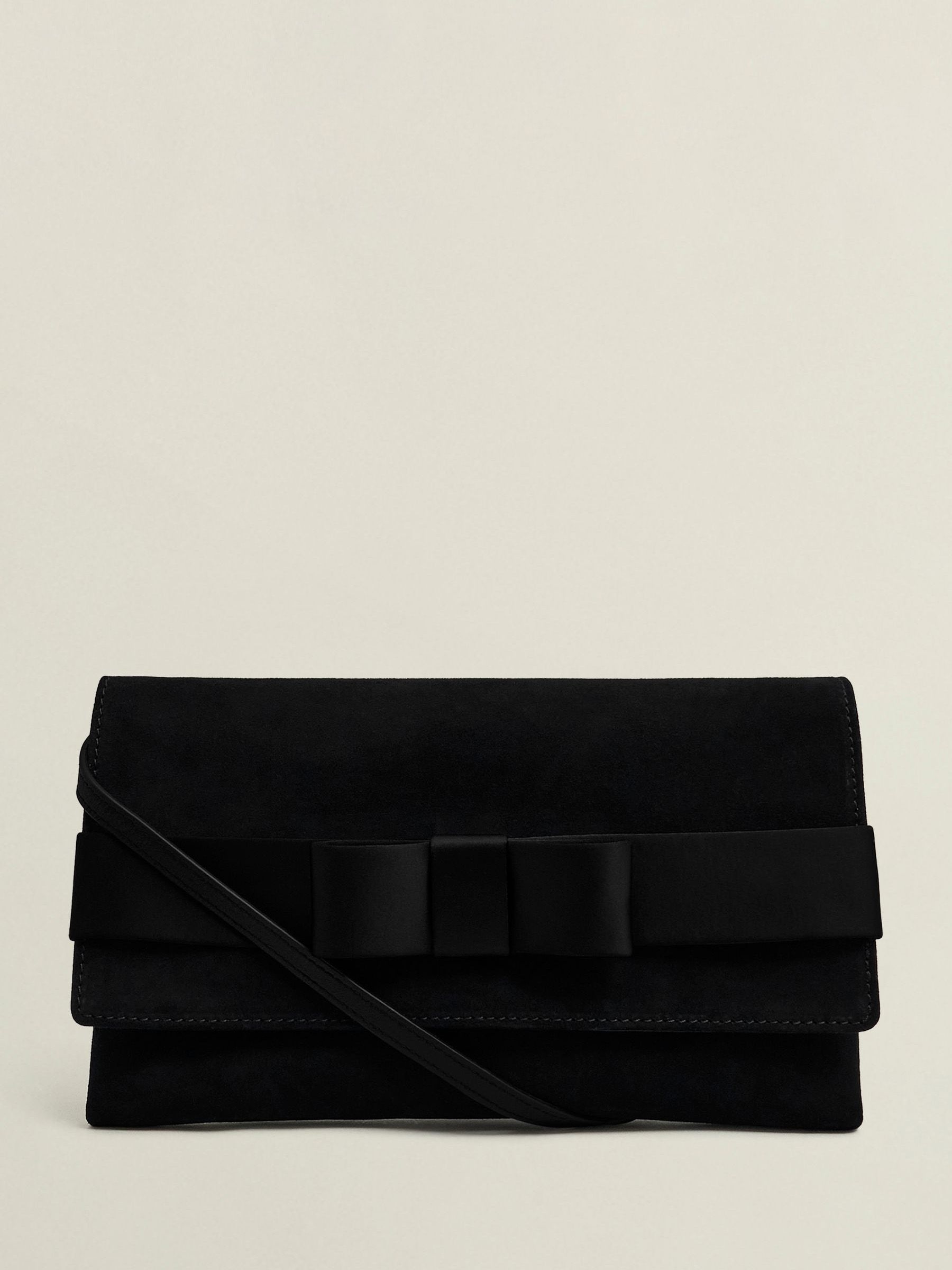 Upcoming gala or end-of-year ball? We’ve reimagined our Renata clutch in luxurious black velvet with a black tie-inspired bow. Soft suede Black tie-inspired bow Classic clutch profile Detachable strap Magnetic closure and internal pocket.
