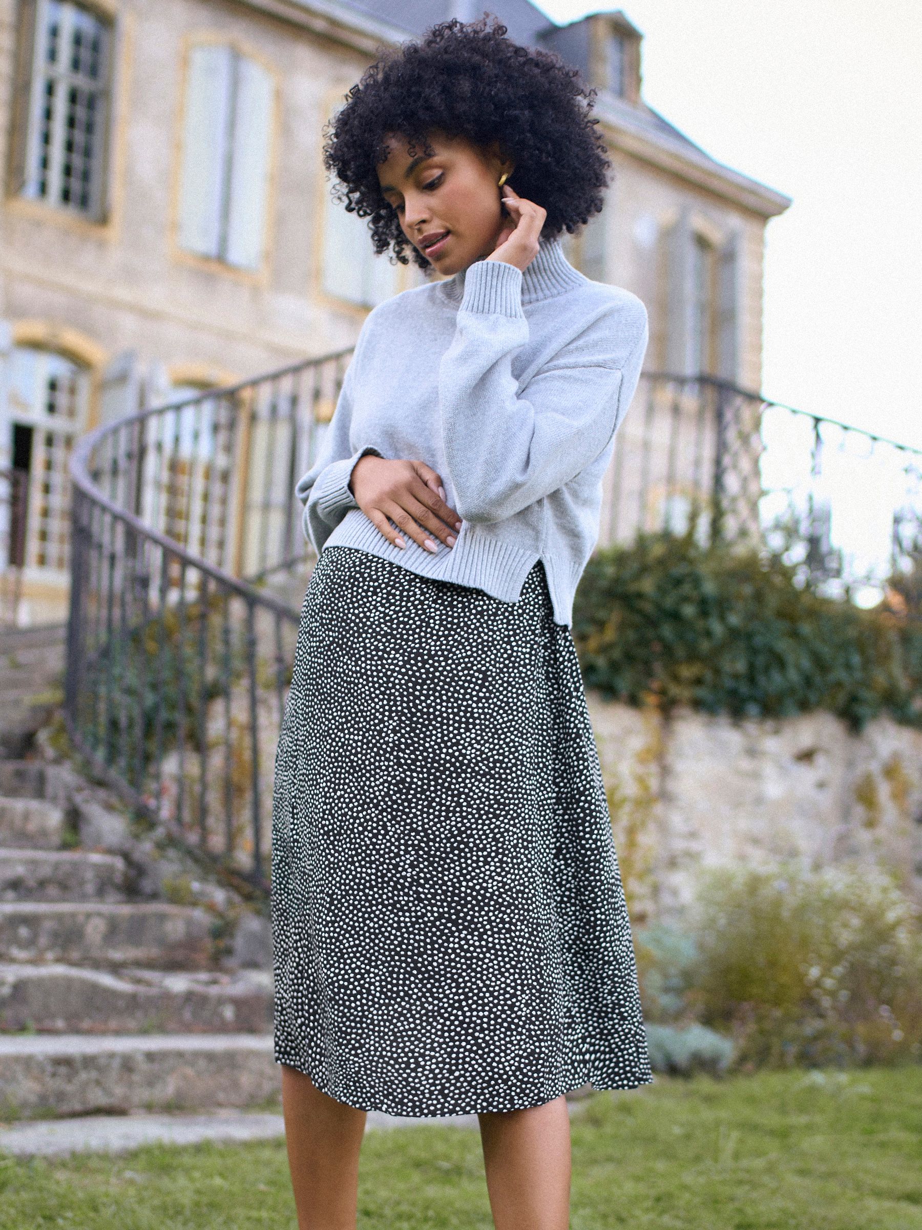 Lift up access for nursing or pumping A-line woven midi skirt with jersey nursing bodice Detachable, relaxed fit knitted top with funnel neck Long sleeves with ribbed cuffs Top & dress can be washed & worn separately Comfy, versatile & SO easy to wear, our Grey 2 in 1 Maternity & Nursing Dress is designed for pregnancy, breastfeeding & new mum life. The super-soft polka dot midi dress drapes beautifully & the relaxed knitted top is designed to offer an easy fit all the way to 9 months. After baby is born, the top lifts up to reveal a built-in jersey nursing bodice for breastfeeding or pumping. And the best part: the cosy knitted top is completely detachable. So, you can wear the two pieces separately or mix & match with other styles in your wardrobe. This dress is perfect for the office or easy everyday wear. Buy your pre-pregnancy size. With over 20 years of maternity expertise, Seraphine styles are designed to grow with you, adapting with you through pregnancy and motherhood.